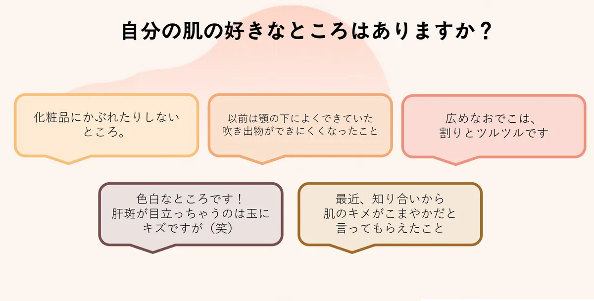 今後もたくさん良いところを見つけていきましょう!私たち運営や他の肌愛メイトさんからヒントをもらうのも良いかもですね♪