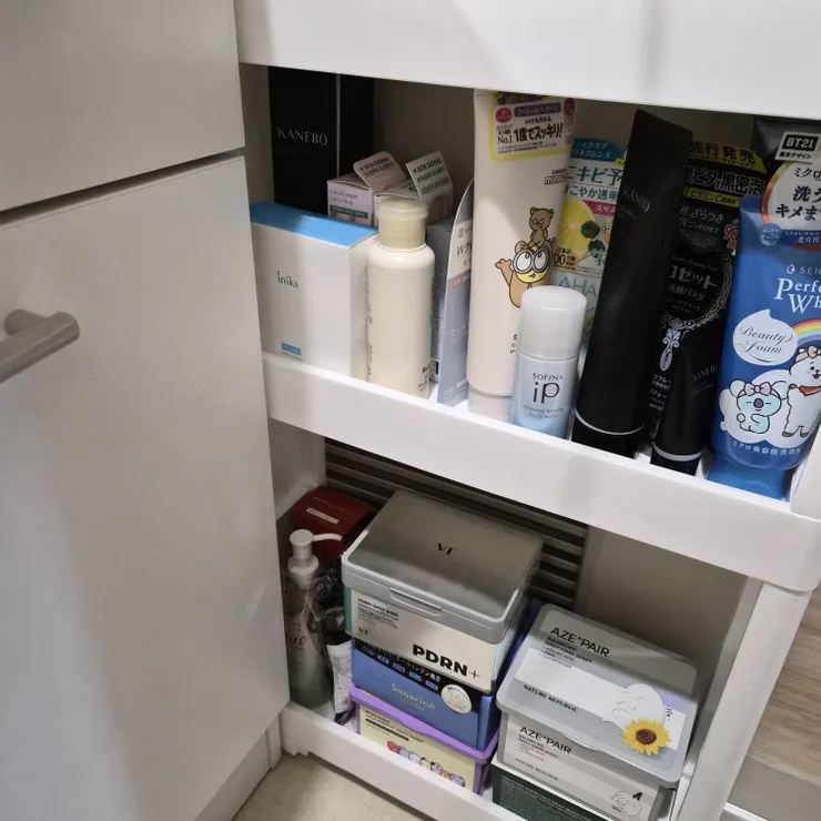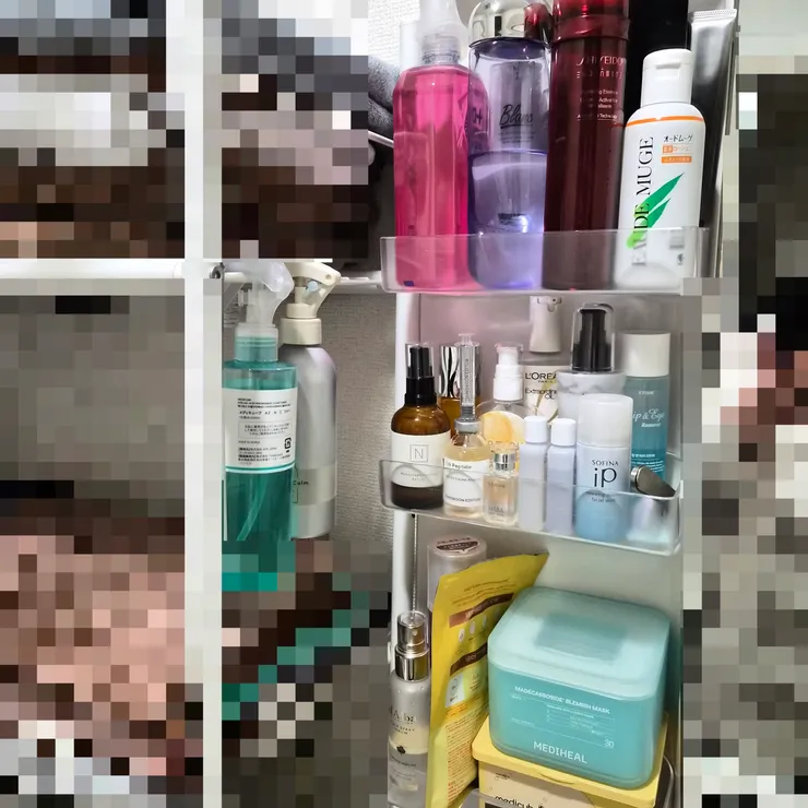 スキンケアスタメンは洗面台に置ける分だけと決めていますが、二軍のスキンケアは購入年ごとに収納箇所を決めていて、手前に開封済み/奥に未開封品と並べて順番に使用しています。