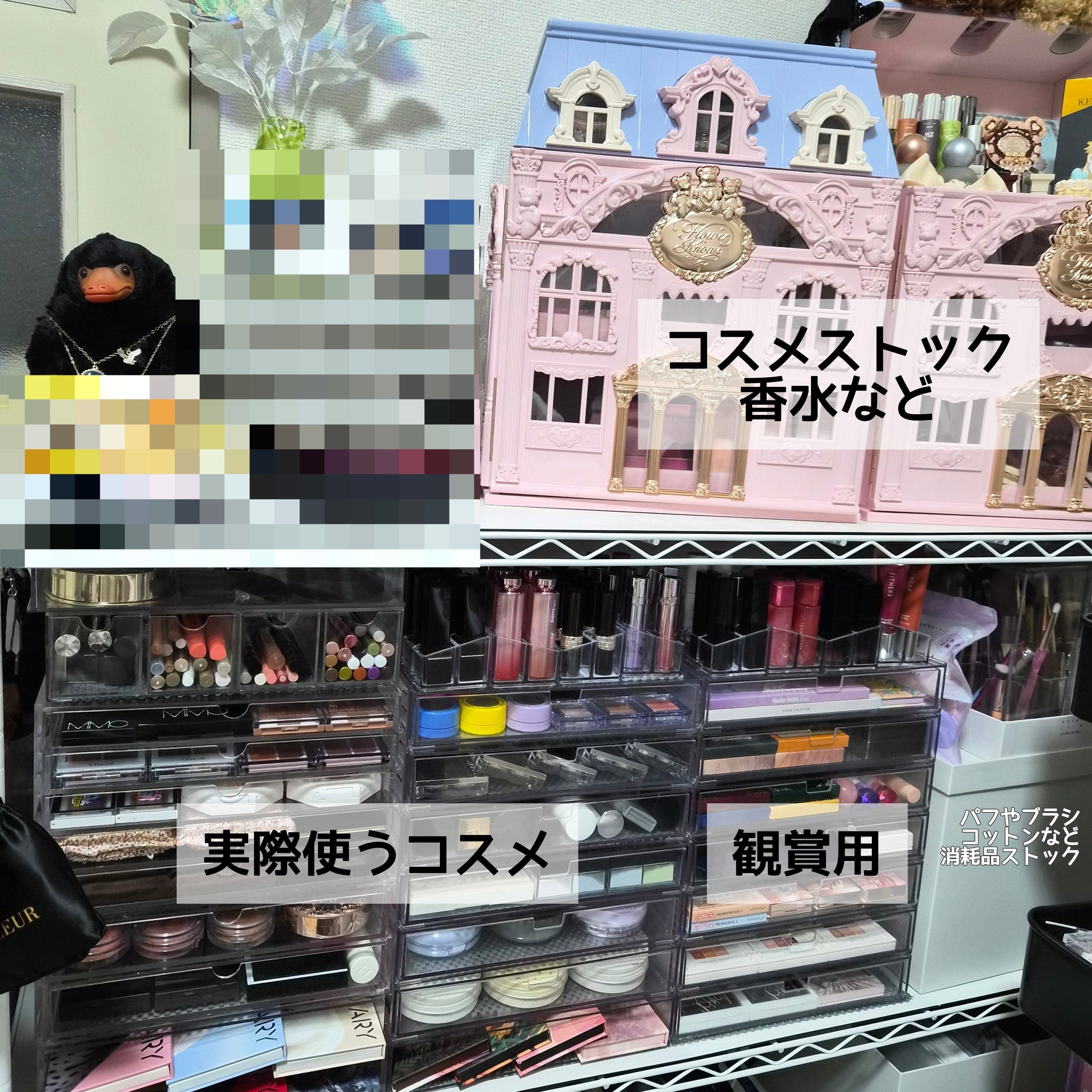この収納に入らなくなったら、泣く泣く古いものから断捨離しています。観賞用コスメエリアのアイテムは顔には使わず、たまに手に塗って遊んでます🥳