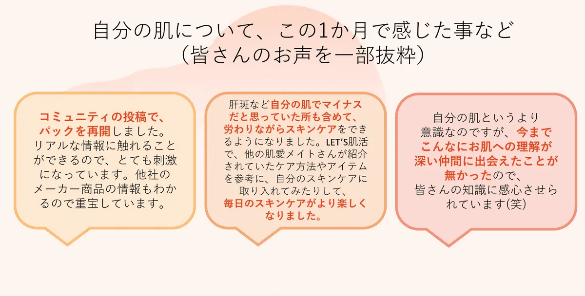 肌と丁寧に向き合う時間や他の肌愛メイトさんとのつながりが、肌活を続ける力になっていることが感じられました✨
