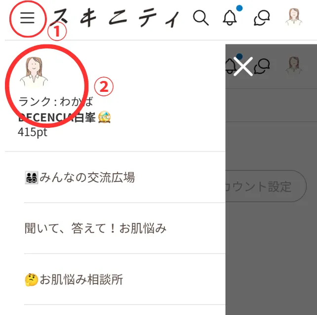 ①スキニティサイトに入り、左上の三本線をタップ→アイコンをタップ
